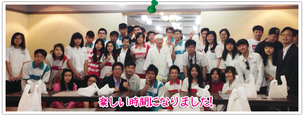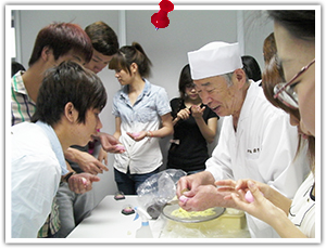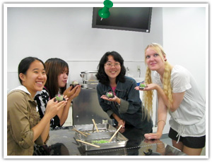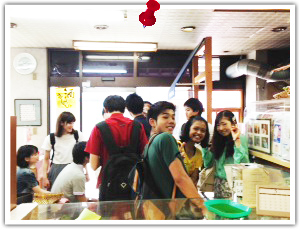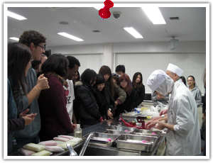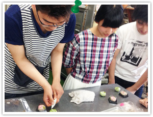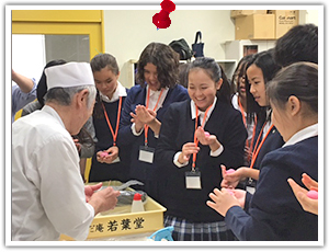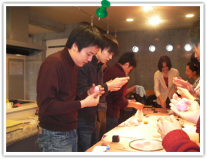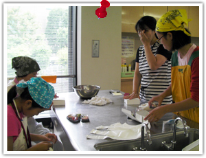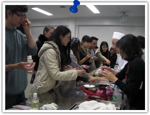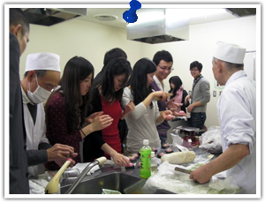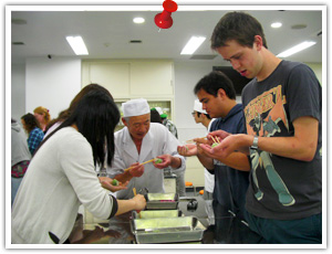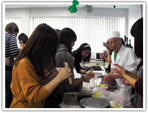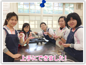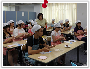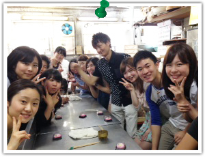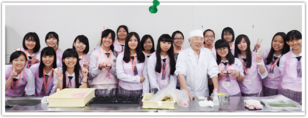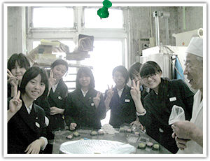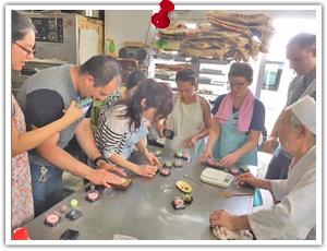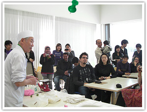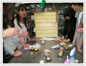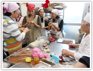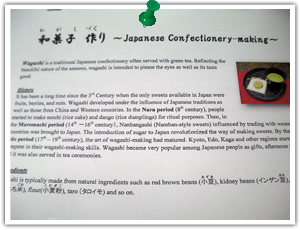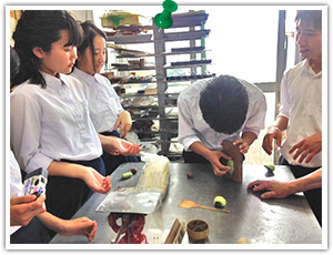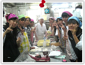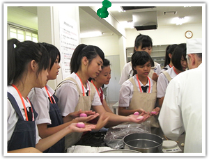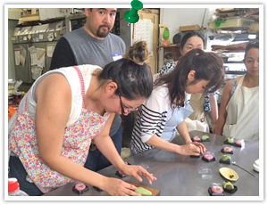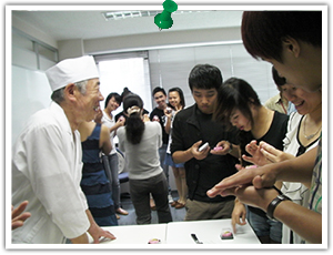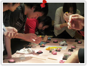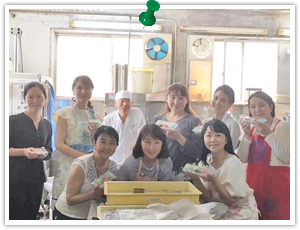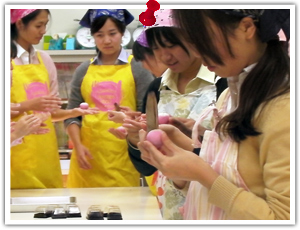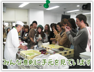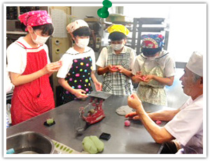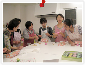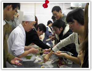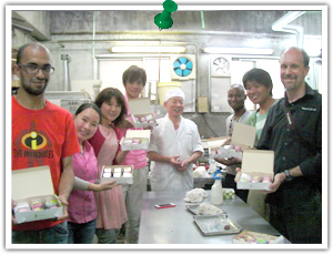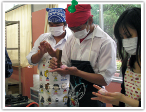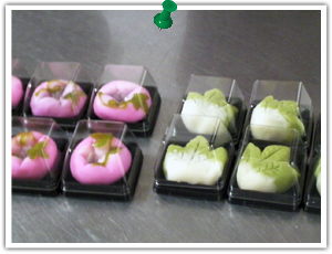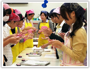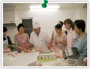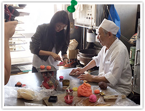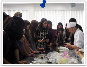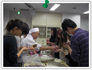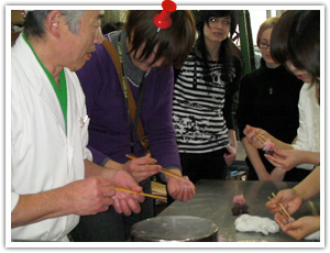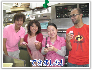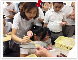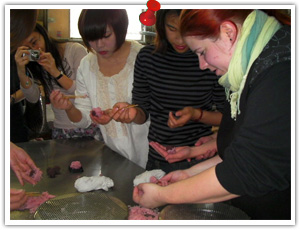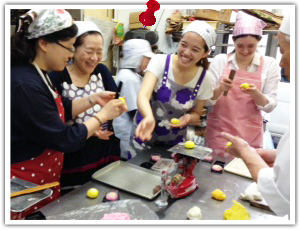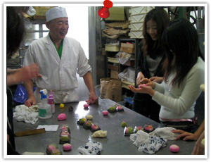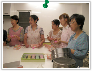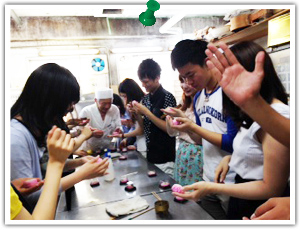 2009年10月10日 若葉堂店内にて桜美林大学留学生が、 和菓子づくり体験を行いました。 1日の主な流れは、 ・店内の珍しい和菓子や置物の写真撮影 ・あんこを煮ている所や饅頭作りを見学 ・秋をテーマに1人3つの上生菓子作り ・和菓子の本を見て日本の文化を説明 その後、町田フォーラムにて留学生が作った上生菓子でお茶会を行いました。 『1日、日本の文化に触れられて、とても楽しかった。』 『中でも、和菓子作りが一番印象に残り、 いい経験ができました。』と喜びの電話を後日頂きました。